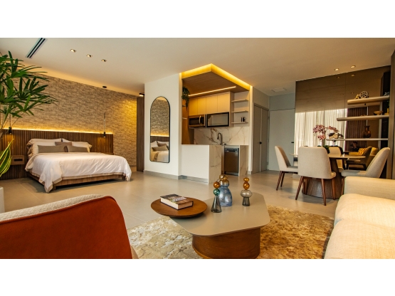 El modelo cuenta con 2 recámaras, 2 baños completos, 1 estacionamiento privado. Su distribución está pensada para maximizar el confort en un espacio compacto, con cocina abierta, sala-comedor integrada y ventanales que permiten excelente iluminación natural. Cada recámara ofrece privacidad y funcionalidad, ideal para estadías ejecutivas, familiares o turísticas.